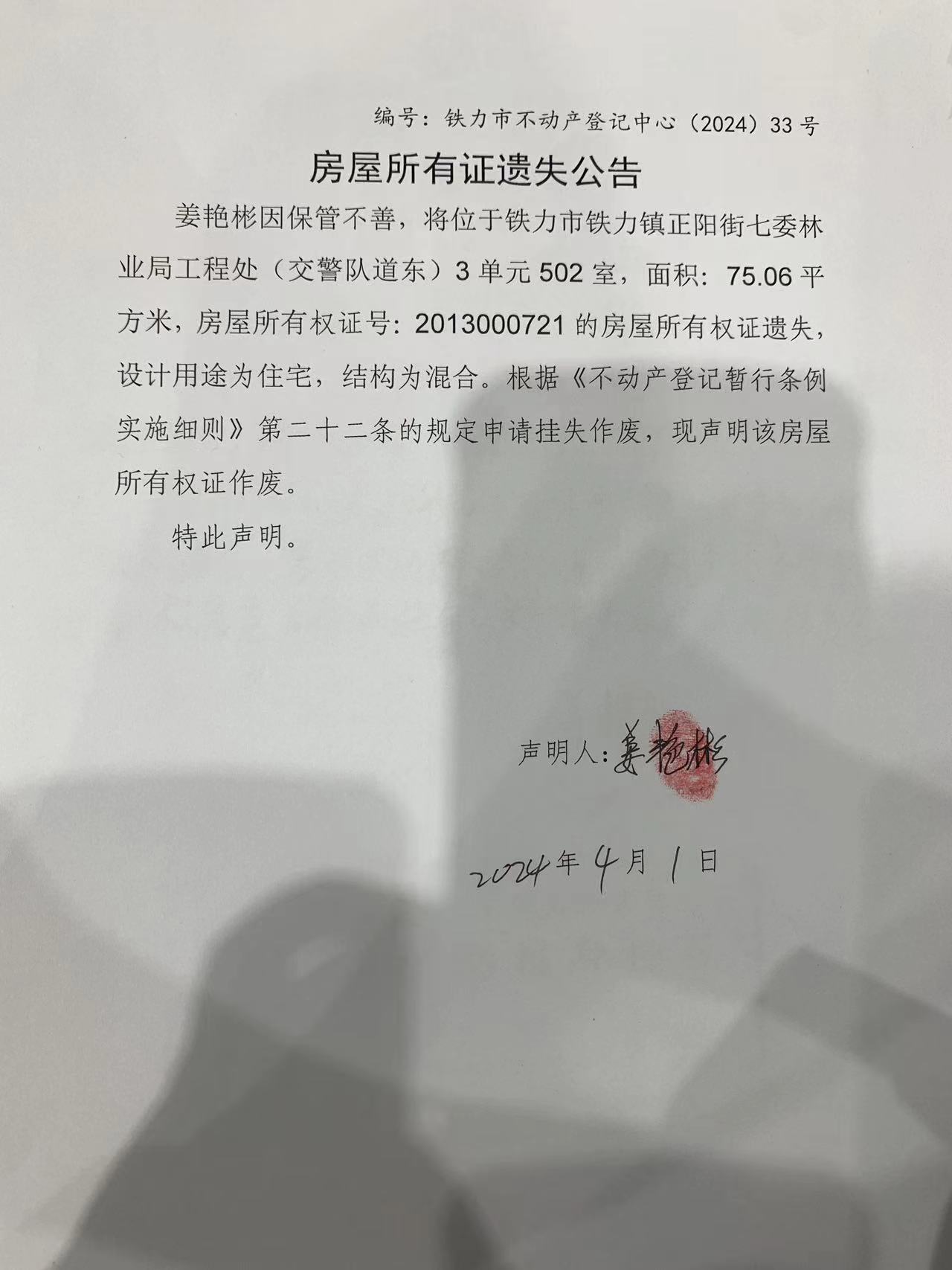铁力市不动产登记中心房屋所有权证遗失(姜艳彬)公示