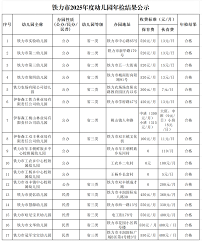 为贯彻落实国务院、省人民政府关于完善和落实幼儿园年检制度的工作相关要求,进一步加强对我市幼儿园的监督管理,规范办园行为,全面提高保育教育质量水平,根据伊春市教育局《关于开展2025年度幼儿园年检工作的通知》(伊教办发〔2025〕44号)文件要求,通过幼儿园自查,教育局实地查看、查阅材料等方式对全市各级各类幼儿园进行年检。现将年检结果公示如下:
