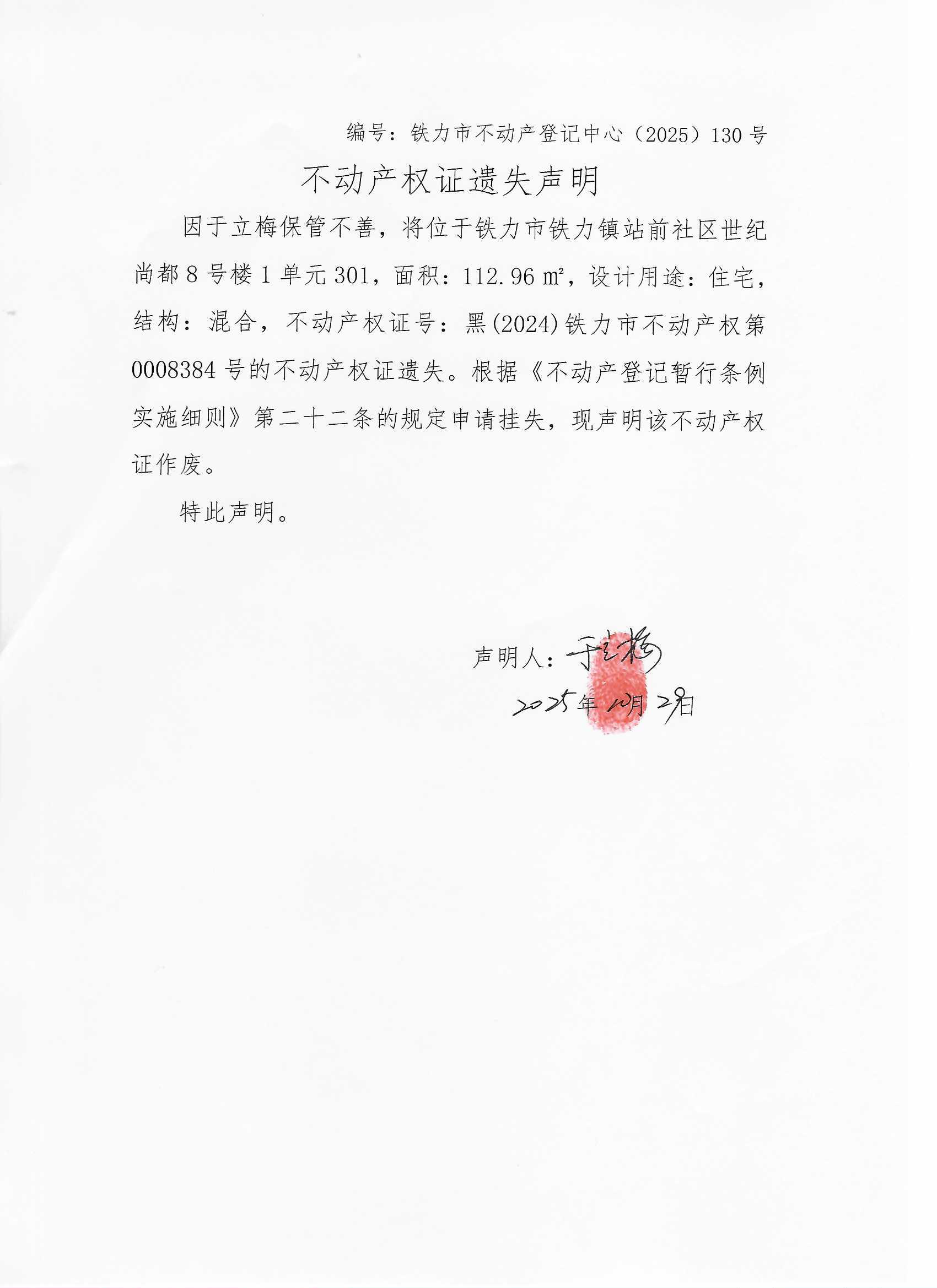 铁力市不动产登记中心不动产权证遗失(于立梅)公示