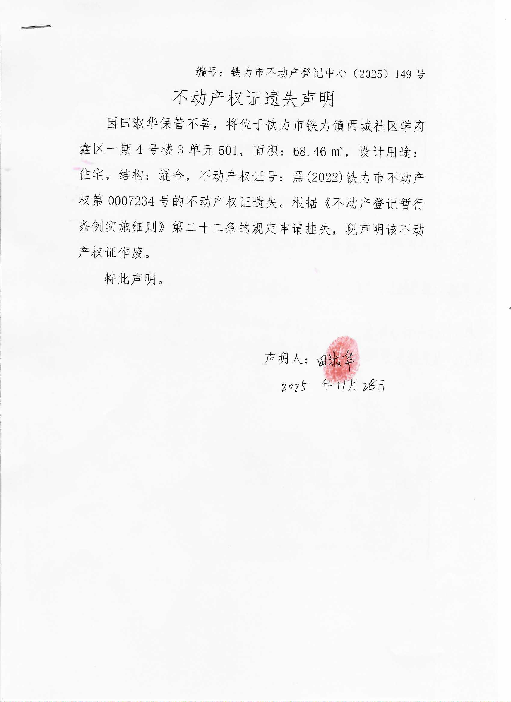 铁力市不动产登记中心不动产权证遗失(田淑华)公示
