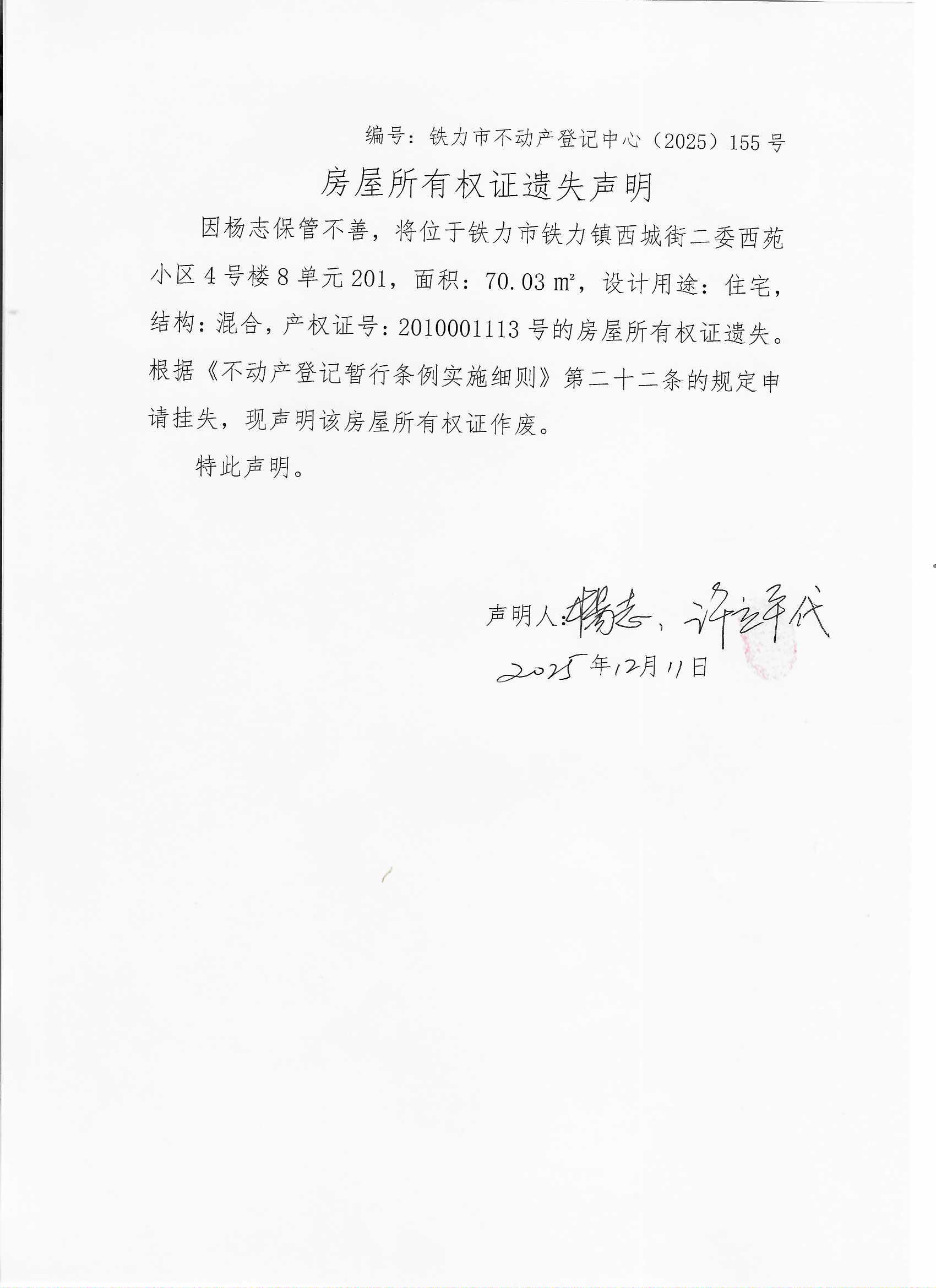 铁力市不动产登记中心房屋所有权证遗失(杨志)公示