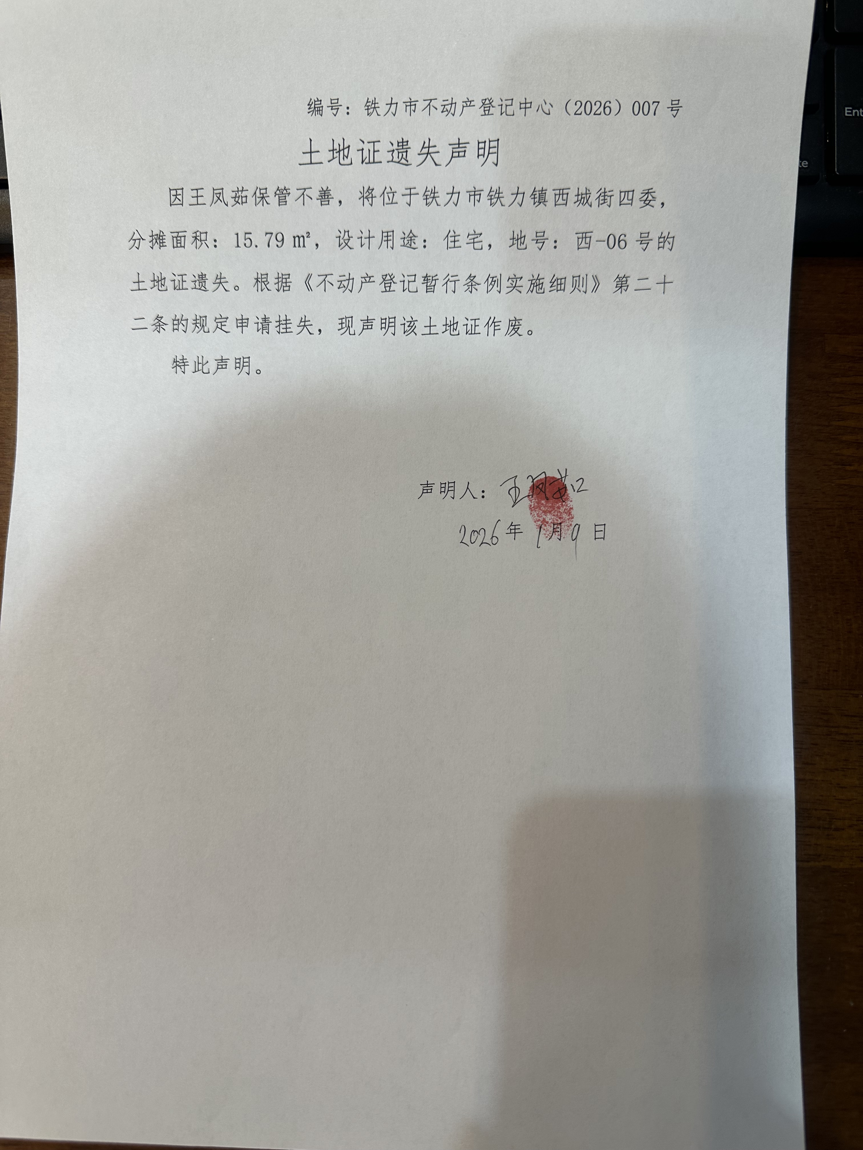 铁力市不动产登记中心土地证遗失声明(王凤茹)公示
