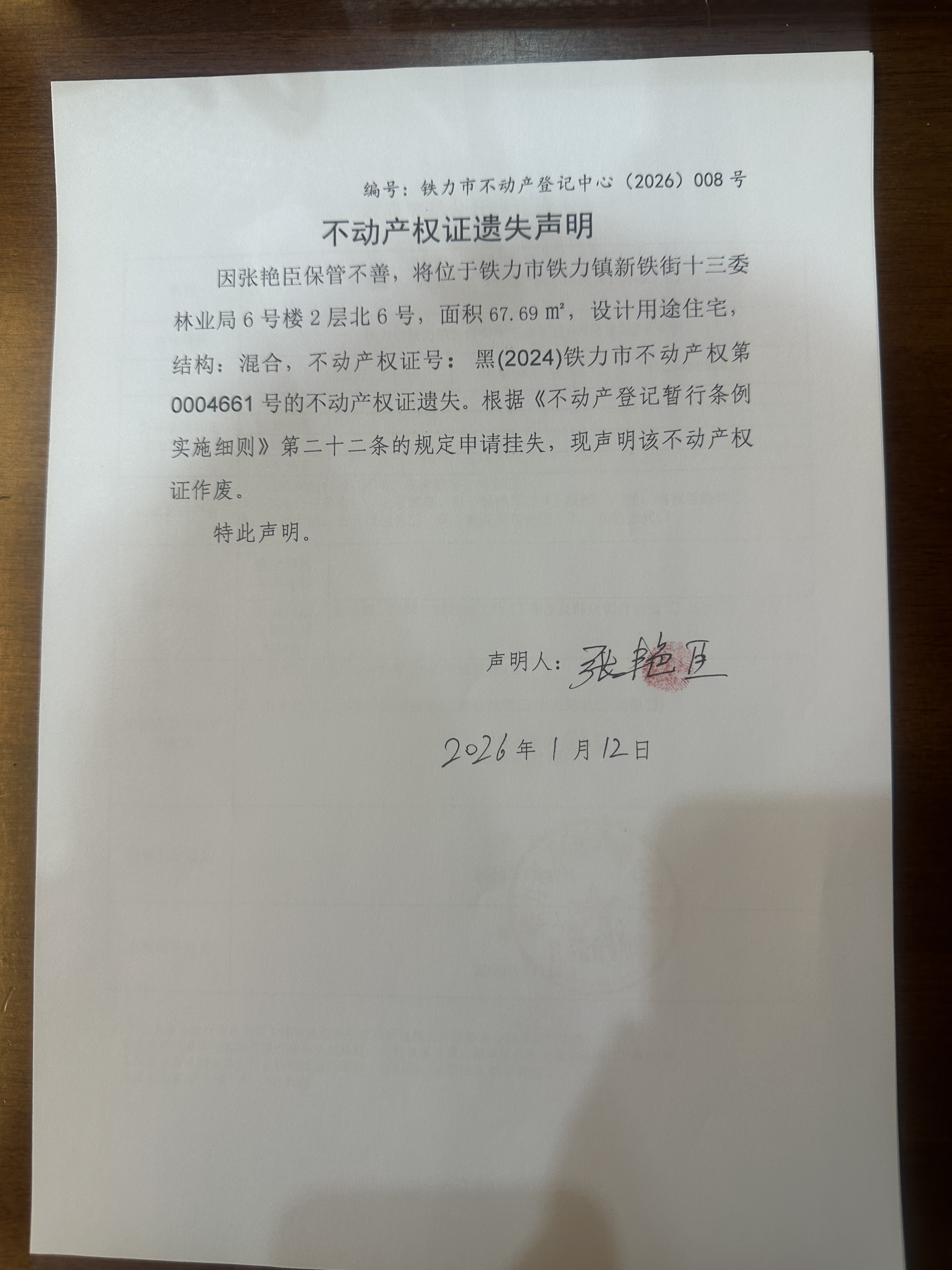 铁力市不动产登记中心不动产权证遗失(张艳臣)公示