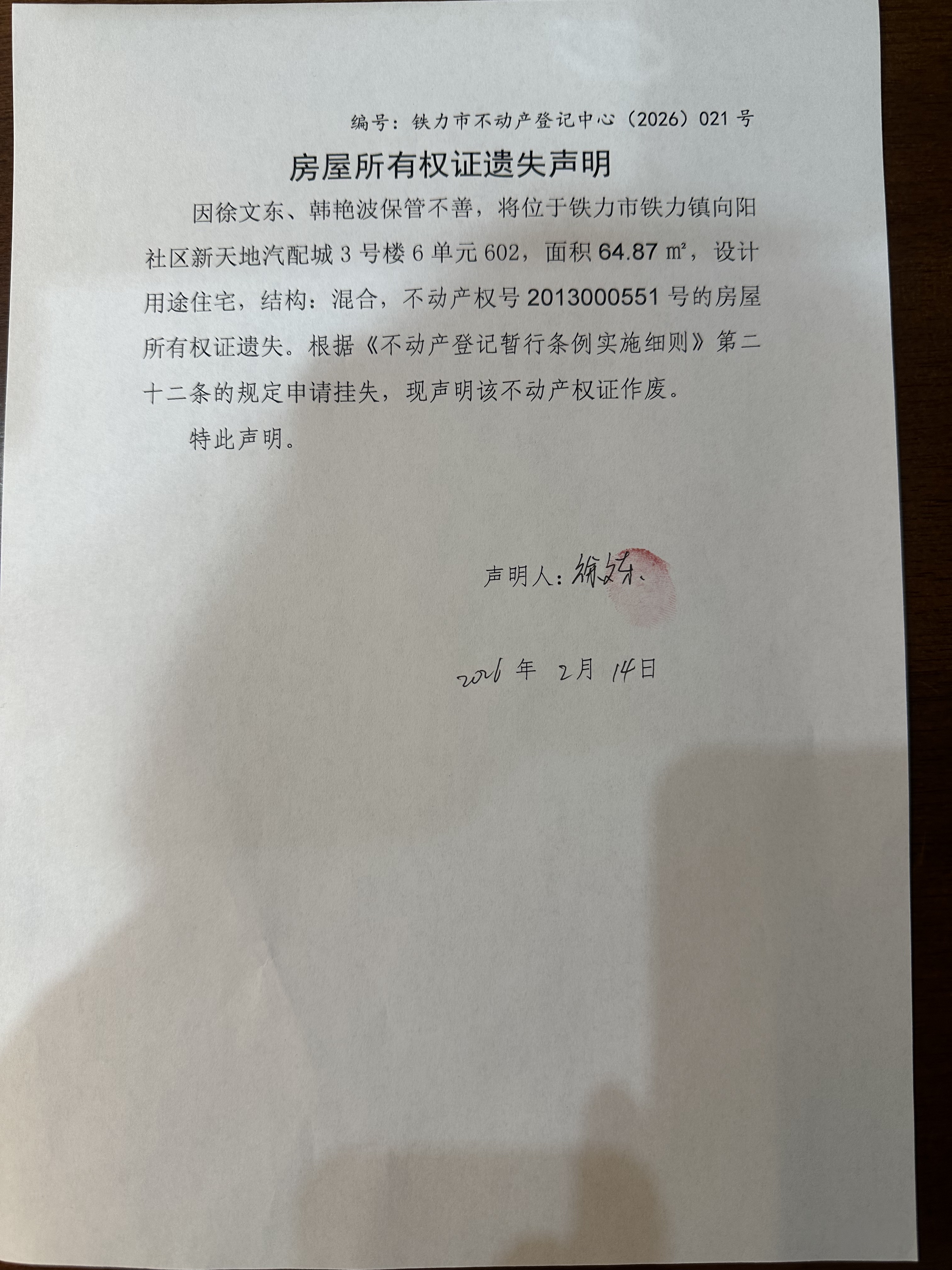 铁力市不动产登记中心房屋所有权证遗失(徐文东、韩艳波)公示