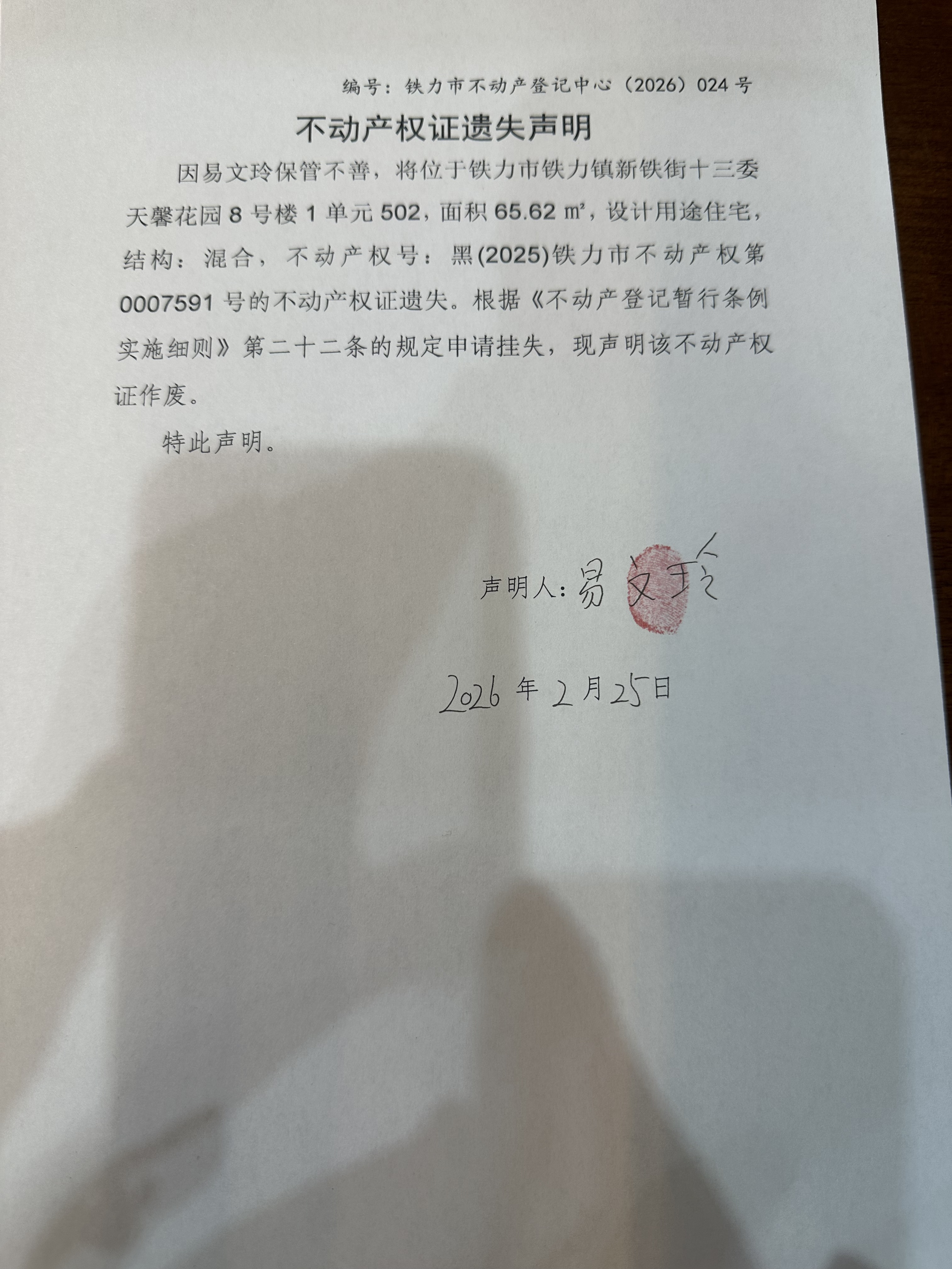铁力市不动产登记中心不动产权证遗失(易文玲)公示