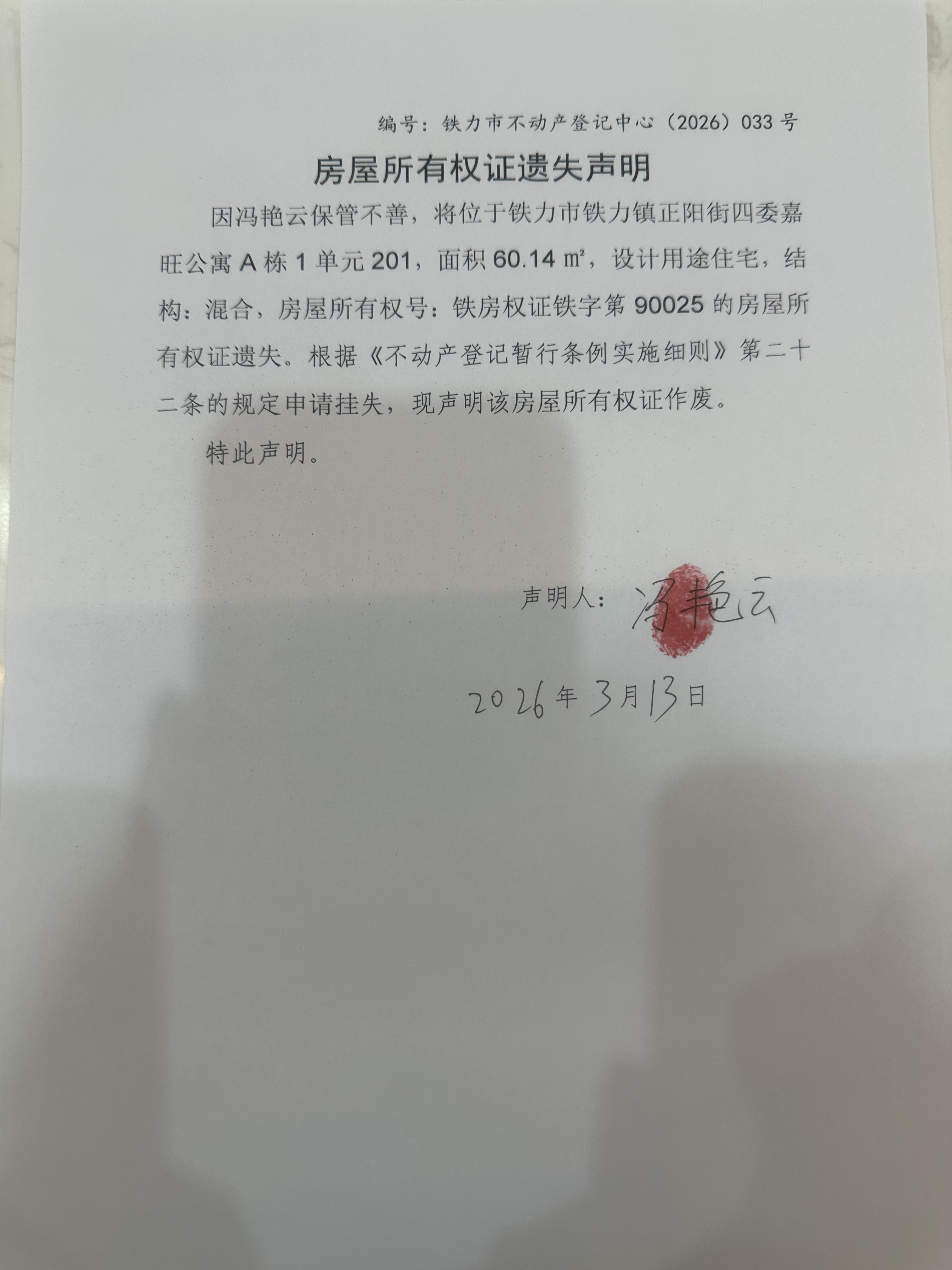 铁力市不动产登记中心房屋所有权证遗失(冯艳云)公示