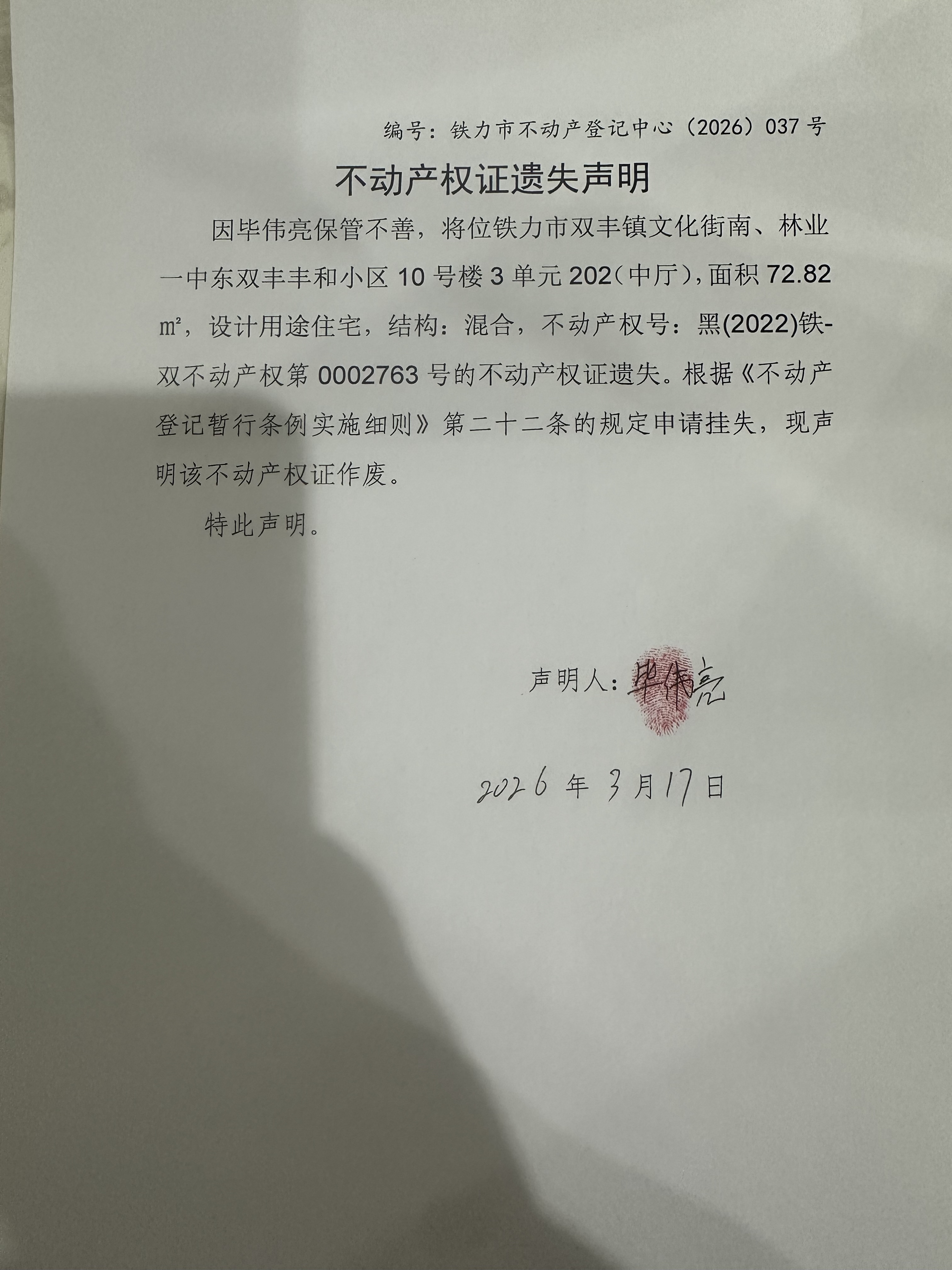铁力市不动产登记中心不动产权证遗失(毕伟亮)公示