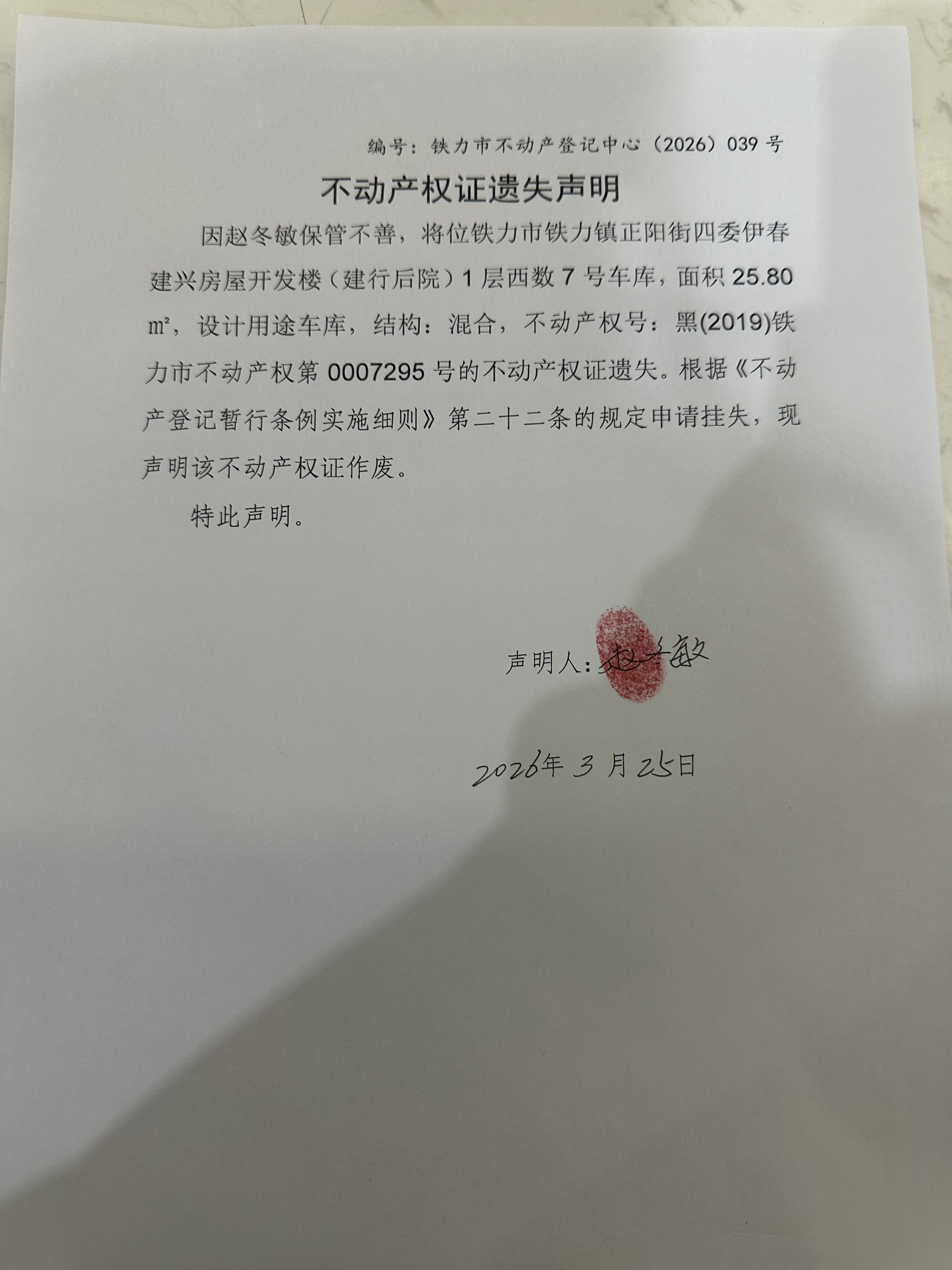 铁力市不动产登记中心不动产权证遗失(赵冬敏)公示