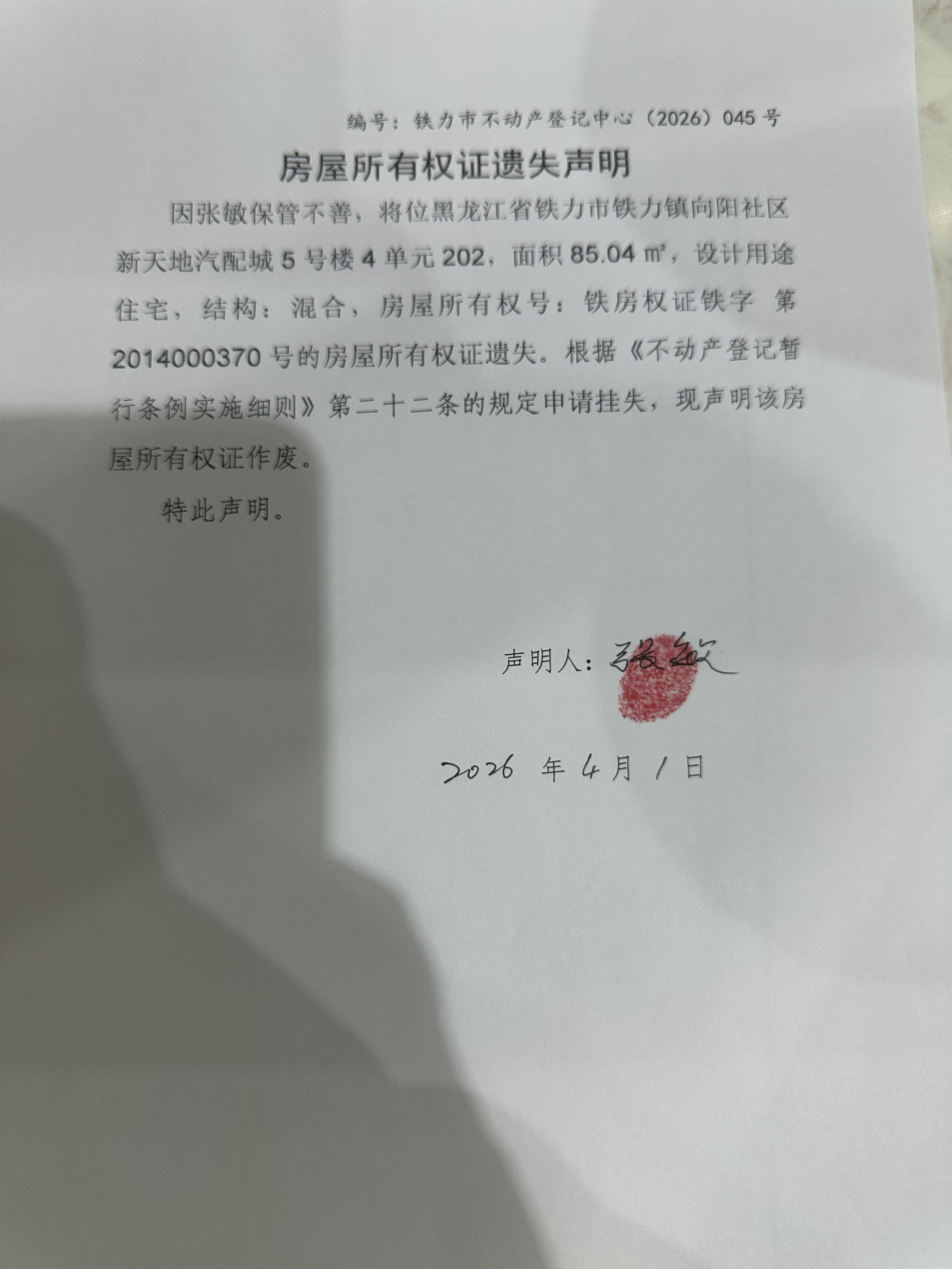 铁力市不动产登记中心房屋所有权证遗失(张敏)公示