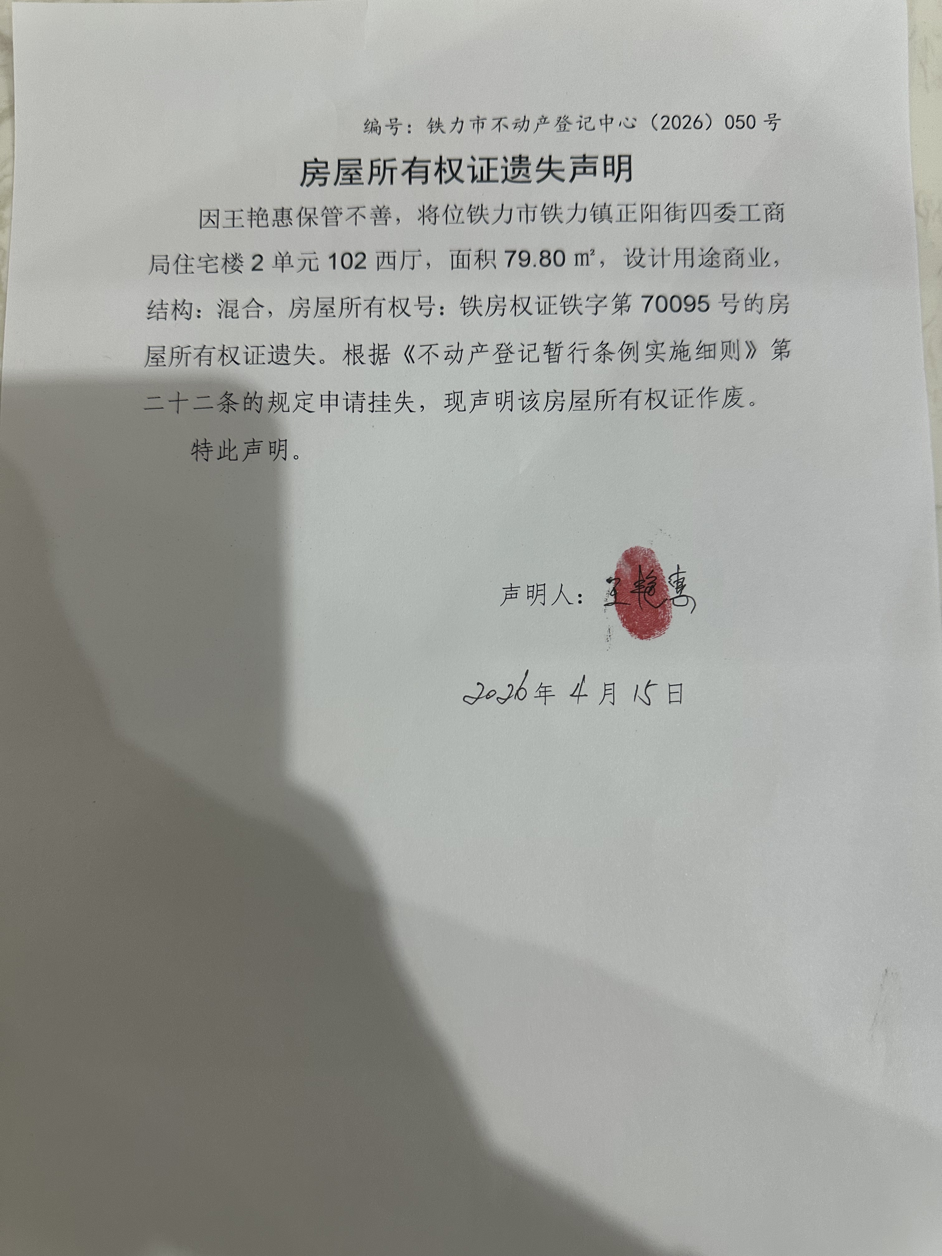 铁力市不动产登记中心房屋所有权证遗失(王艳惠)公示