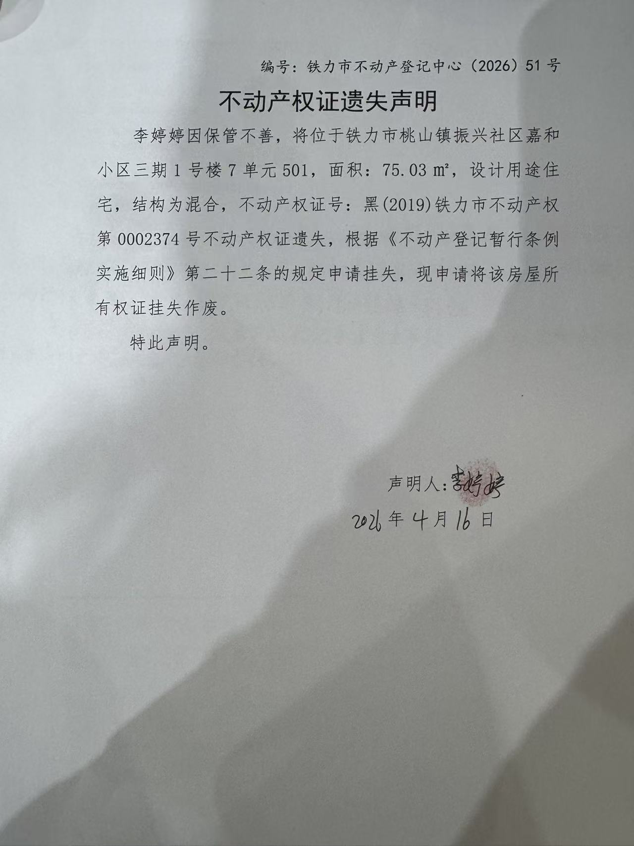 铁力市不动产登记中心不动产权证遗失(李婷婷)公示