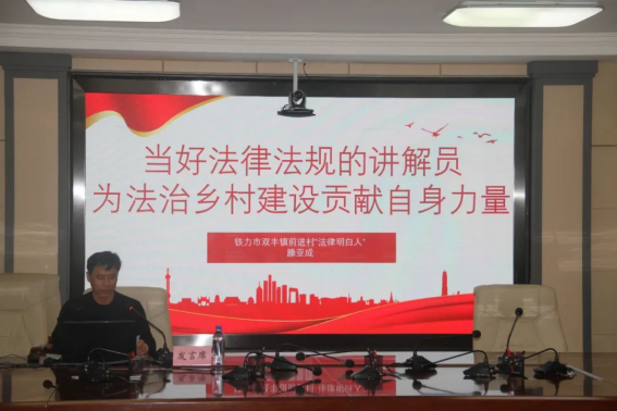 铁力市双丰镇前进村“法律明白人”、黑龙江省“最美法律明白人”获评者滕亚成,以《当好法律法规的讲解员为法治乡村建设贡献自身力量》为题,结合发生在履职过程中鲜活案例,从法律学习、阵地建设、普法宣传、矛盾化解四个角度出发,向全市“法律明白人”分享了工作经验。