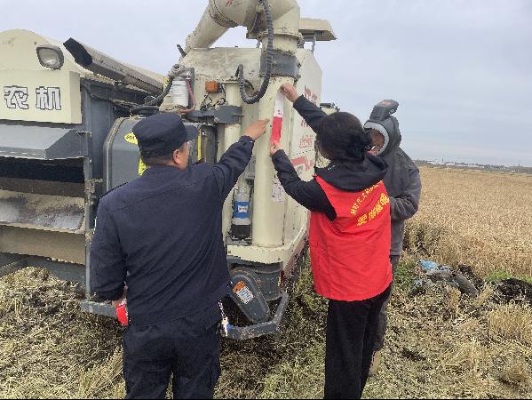 活动中,工作人员与志愿者组成专项服务小队,直奔秋收一线。在田间作业现场,工作人员仔细检查农机的刹车、灯光、安全防护装置等关键部件,对存在安全隐患的农机现场指导整改,确保农机“带病不上岗”;针对夜间作业视线差的问题,志愿者们逐台为农机粘贴反光贴,用“小贴纸”织密“安全网”。同时,在农家院落和农机集中停放点,志愿者们通过发放农机安全知识宣传页、现场讲解的方式,向农户重点宣讲农机操作规范、故障应急处理、道路行驶安全等注意要点,用通俗易懂的语言解答农户疑问,切实提升农户的安全操作意识和应急处置能力。