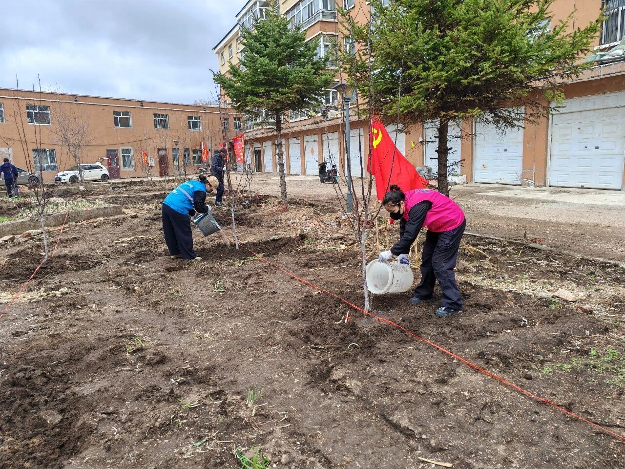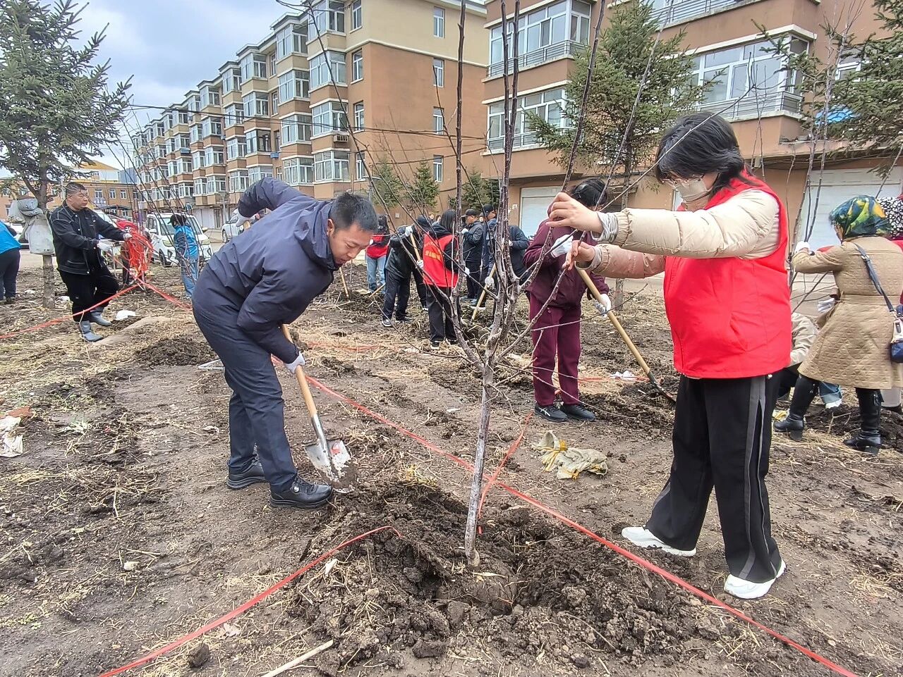 经过两个多小时的辛勤劳动,200余株王族海棠整齐排列在各小区空地上,迎风挺立,为社区注入了勃勃生机。今后,这些树苗将由党员认养管护,确保栽一棵活一棵、种一片绿一片。