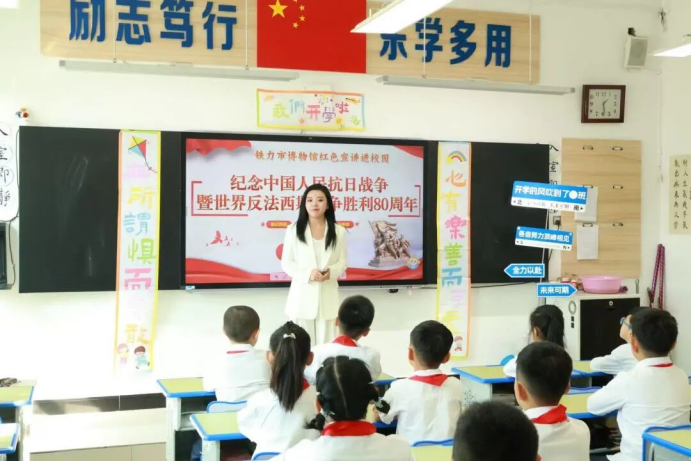 为纪念中国人民抗日战争暨世界反法西斯战争胜利80周年,弘扬伟大抗战精神,激励广大学生铭记抗战历史,传承红色基因,9月1日,铁力市博物馆受邀来到市第四小学开展“弘扬伟大抗战精神——纪念中国人民抗日战争暨世界反法西斯战争胜利80周年”主题宣讲活动。