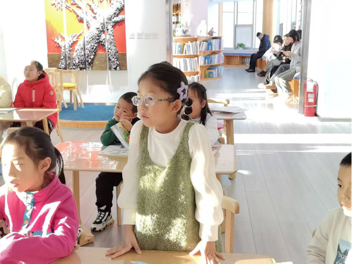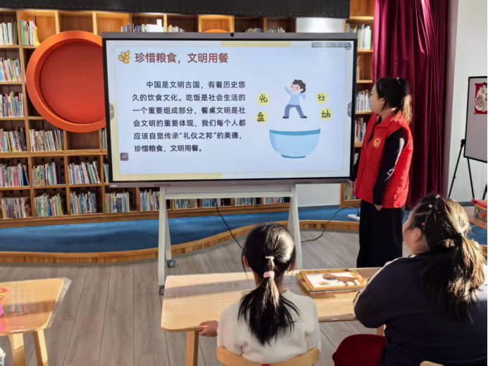 活动现场,馆员琪琪老师以绘本讲读为切入点,通过《一粒米的旅行》等趣味读物,带领孩子们追溯粮食从田间到餐桌的历程,配合古诗《悯农》的深情诵读,让“谁知盘中餐,粒粒皆辛苦”的诗句不再是文字符号,而是化作具象的劳动场景。随后,科普视频与PPT展示生动呈现了从春耕到秋收、从田间到餐桌的粮食诞生历程,以及铁力本地农户耕耘黑土地的真实画面,让孩子们直观感受每一粒粮食背后的汗水与坚守,深刻理解勤俭节约不仅是传统美德,更是保障粮食安全、践行社会主义核心价值观的具体行动。互动问答环节中,孩子们积极分享自己在家的“光盘小行动”,他们争相表达自己对节约粮食的看法,在思想的碰撞中深化了对“勤俭”这一传统美德与现代“光盘行动”紧密联系的认识,初步构建了“节约光荣、浪费可耻”的价值判断。