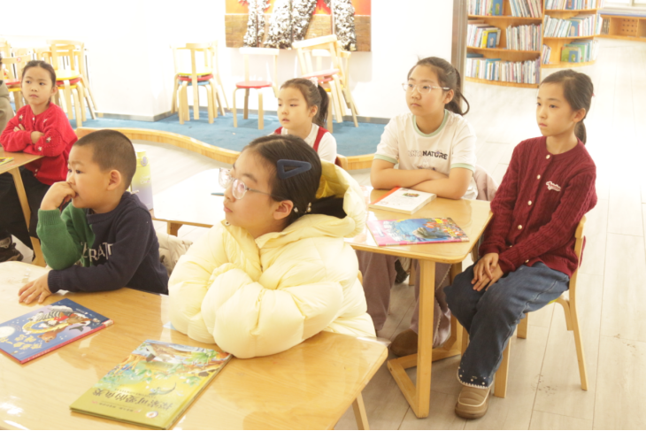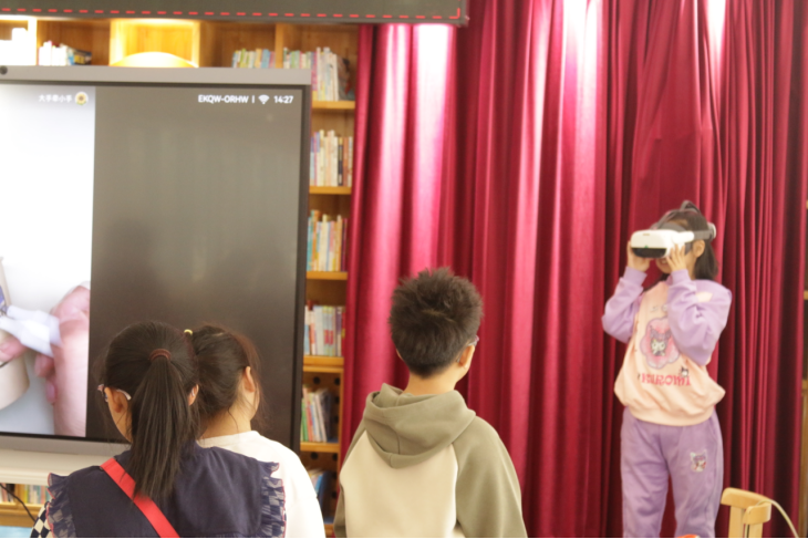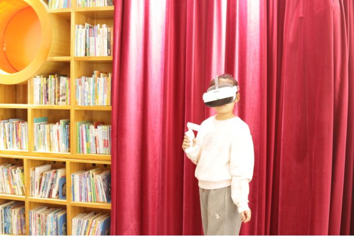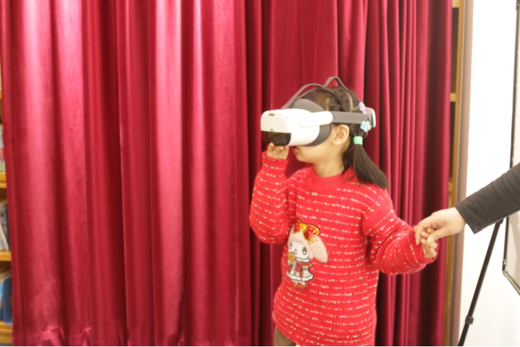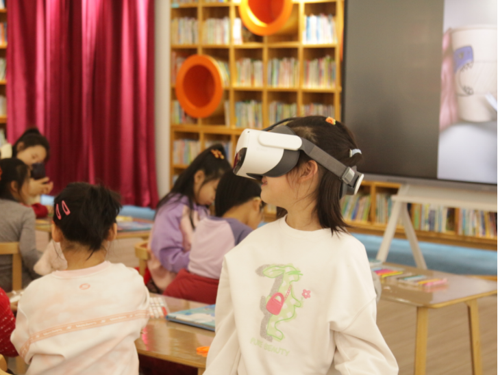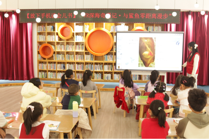 活动现场,馨馨老师借助VR虚拟现实技术,让神秘辽阔的深海世界“移步眼前”。孩子们戴上设备,便能亲身潜入蔚蓝海底,与凶猛又灵动的鲨鱼零距离漫步,看鱼群环绕穿梭、珊瑚摇曳生姿,逼真的海底场景与生动的海洋生物习性直观呈现,原本抽象的海洋知识瞬间变得鲜活可感。随后的绘本共读环节,馆员带领孩子们翻阅精美海洋科普绘本与图书,结合VR场景中的观察所得,以启发式的提问和讲故事的方式,引导孩子们思考鲨鱼的生存特点与海洋生态知识,将知识性、趣味性无缝衔接,让孩子们在亲子共读、同伴交流中深化认知,培养阅读兴趣。